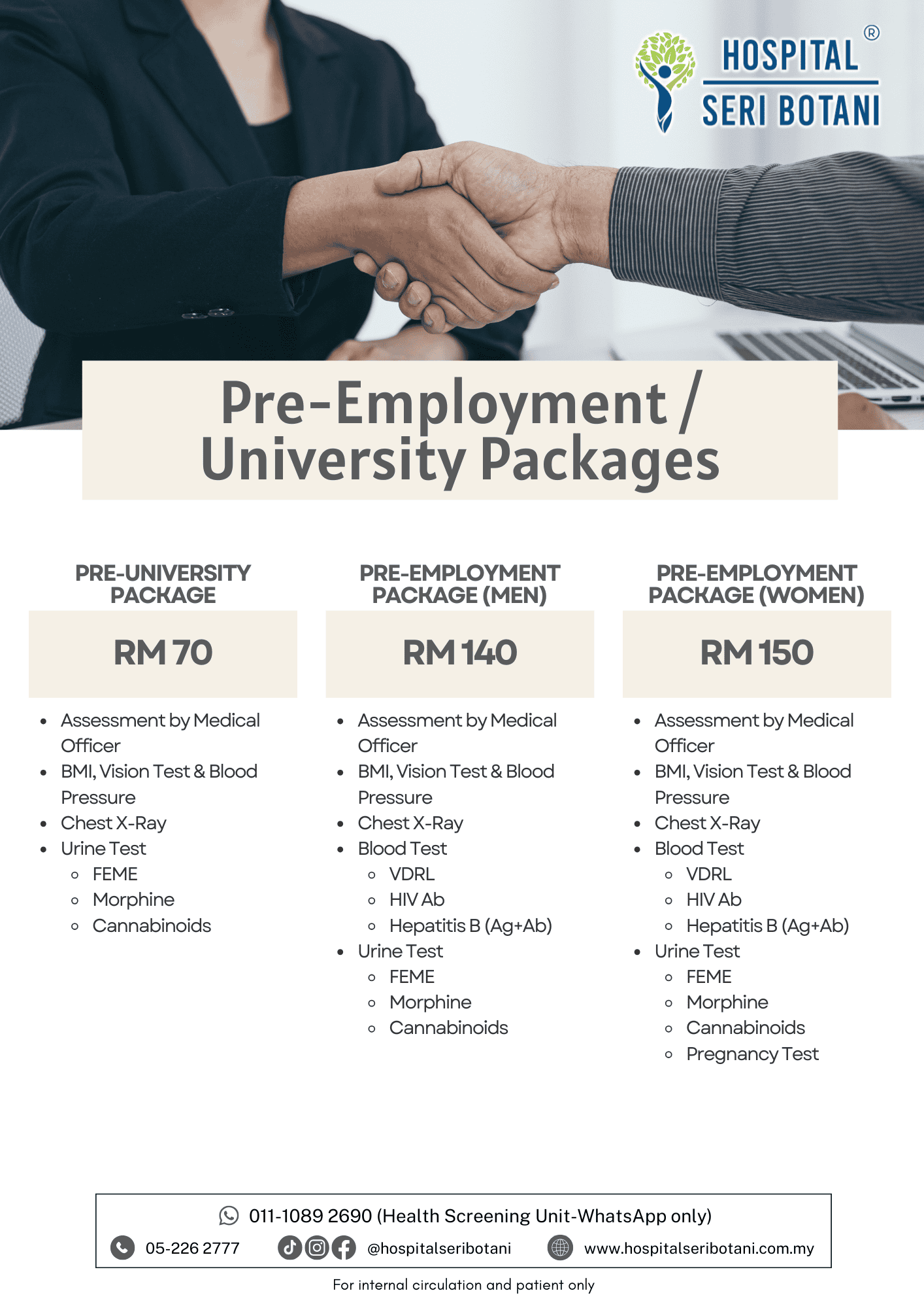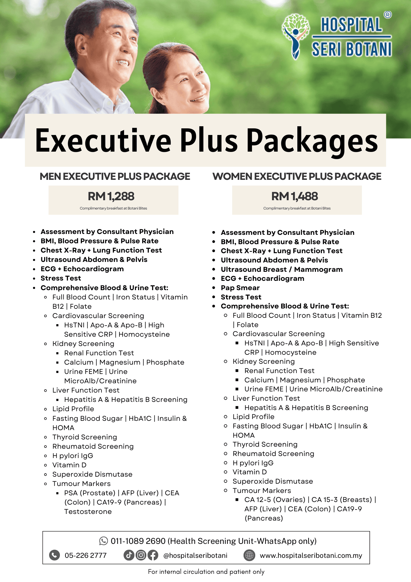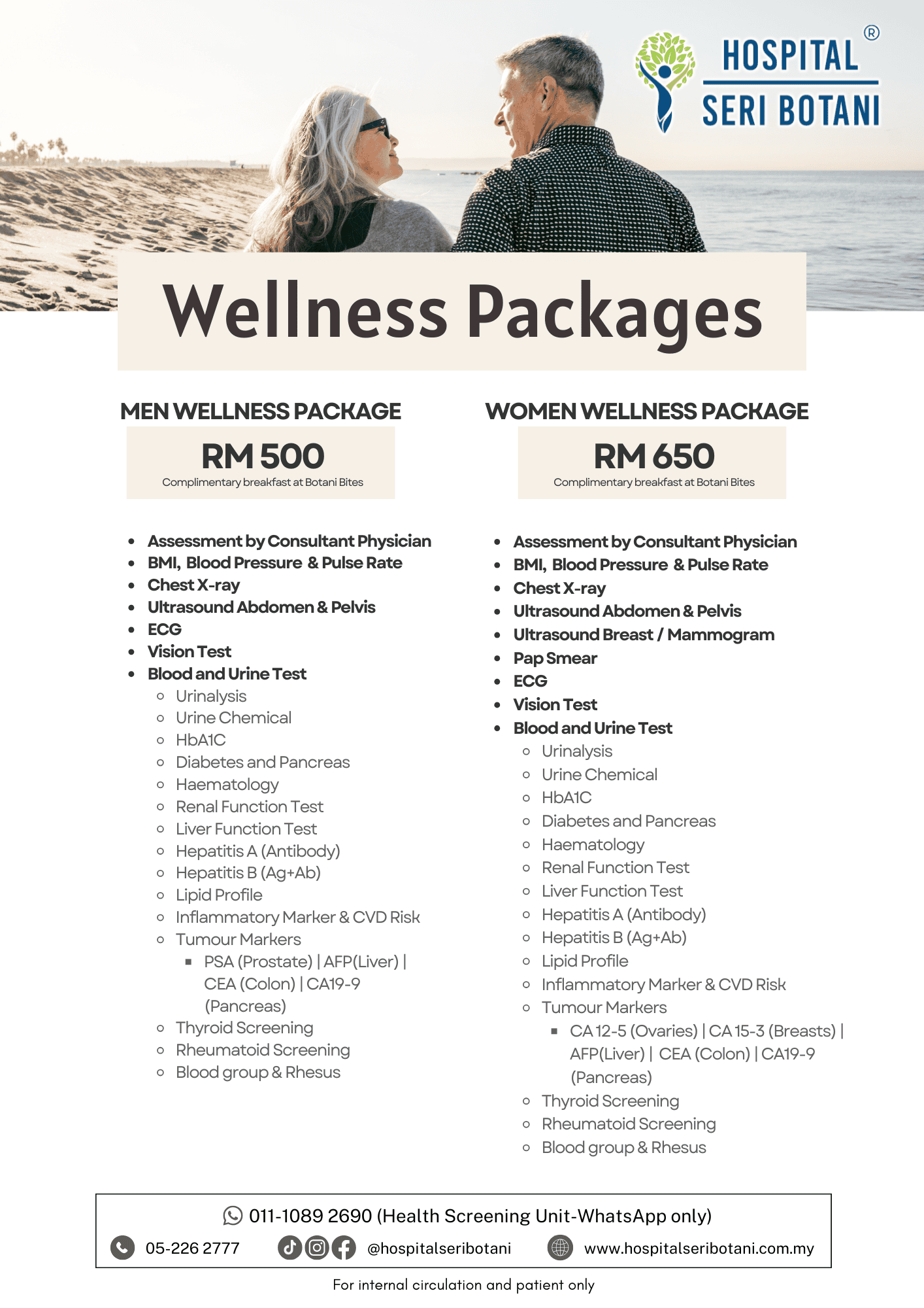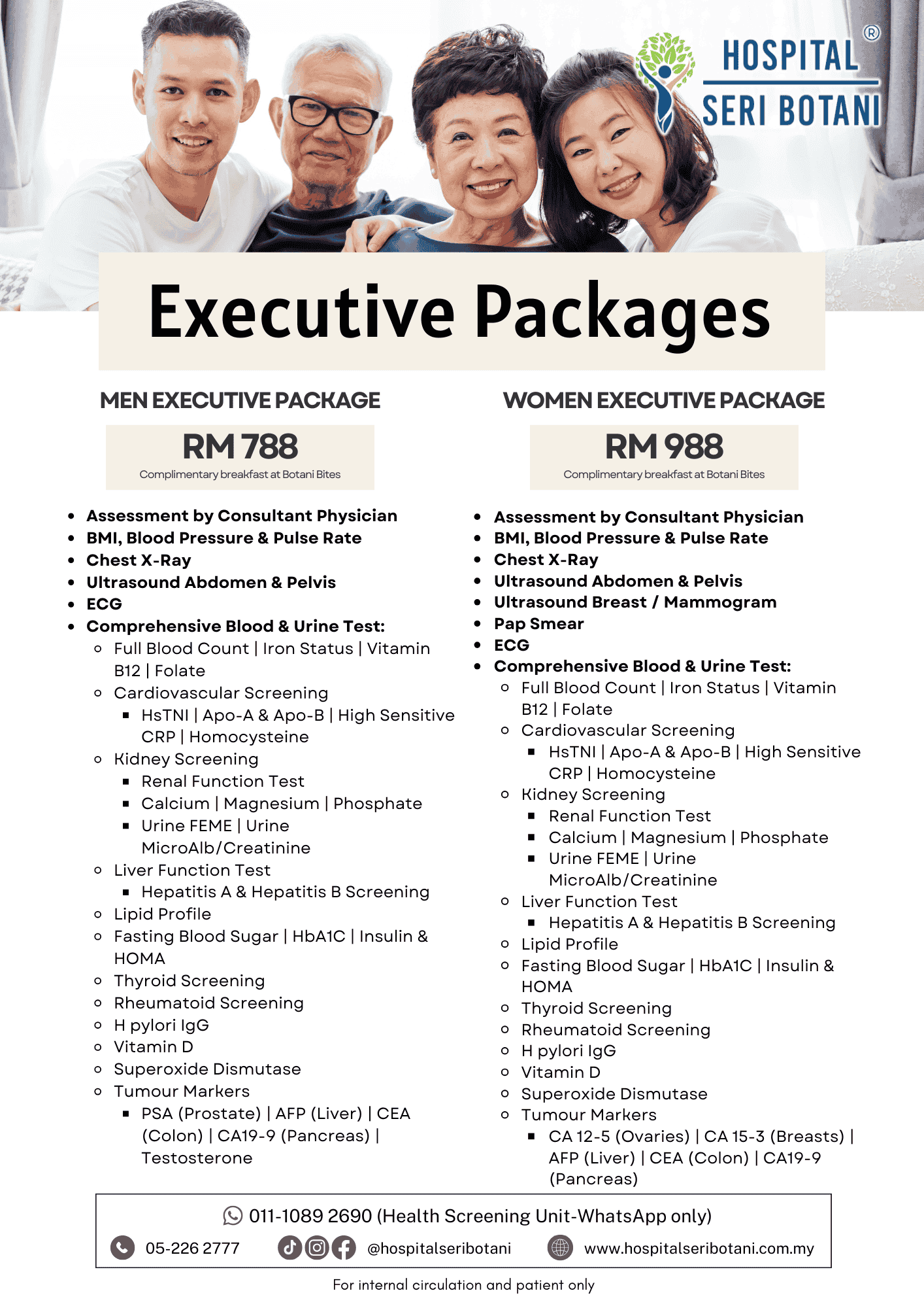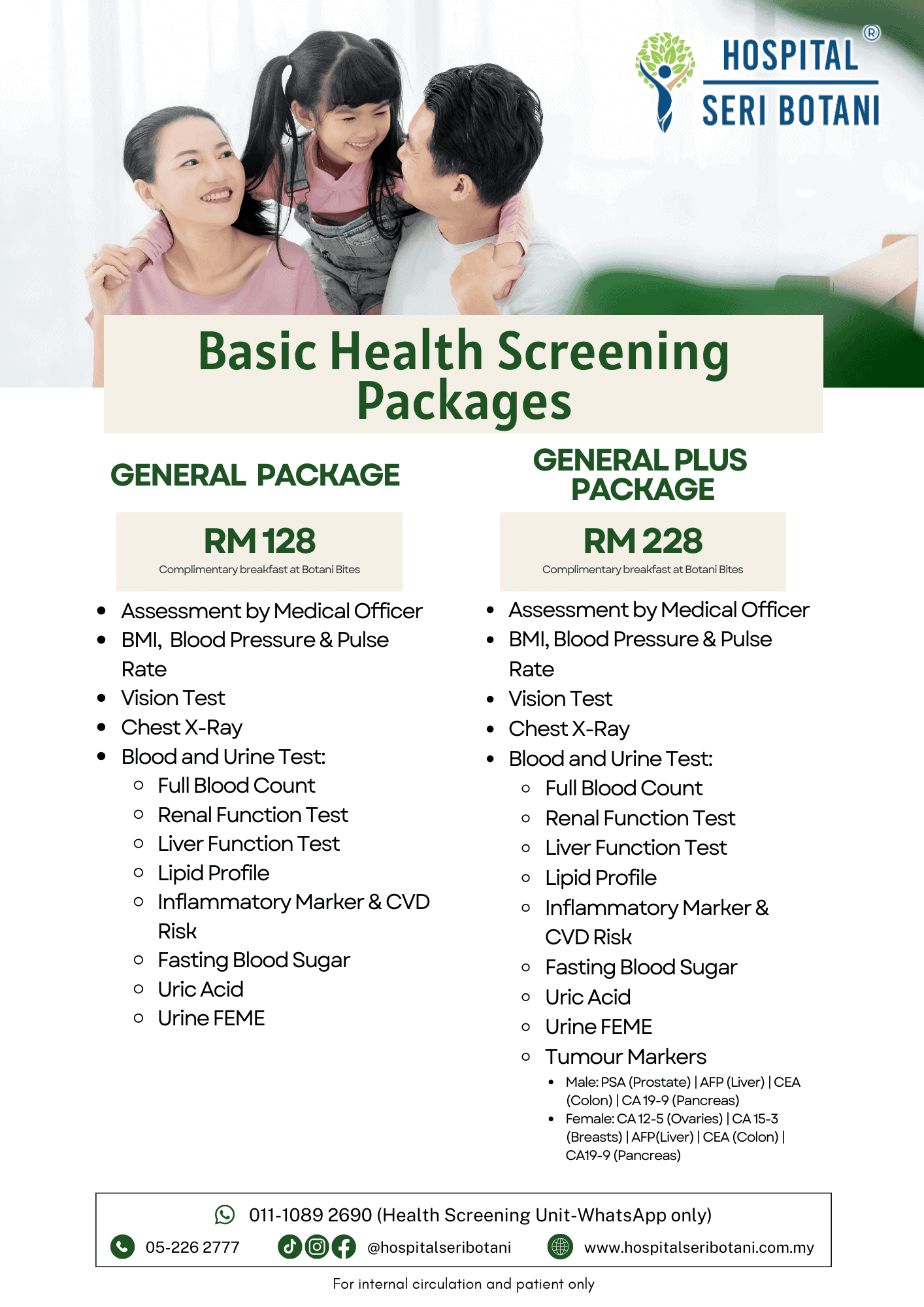 Regular health screening helps detect potential health risks early, even before symptoms appear. At Hospital Seri Botani, we offer screening programmes tailored to different needs—whether for general wellness, employment, specialised gender-based screening, or optional diagnostic add-ons.
